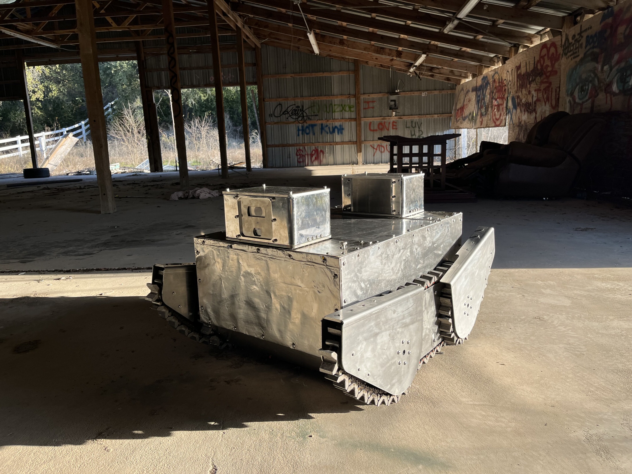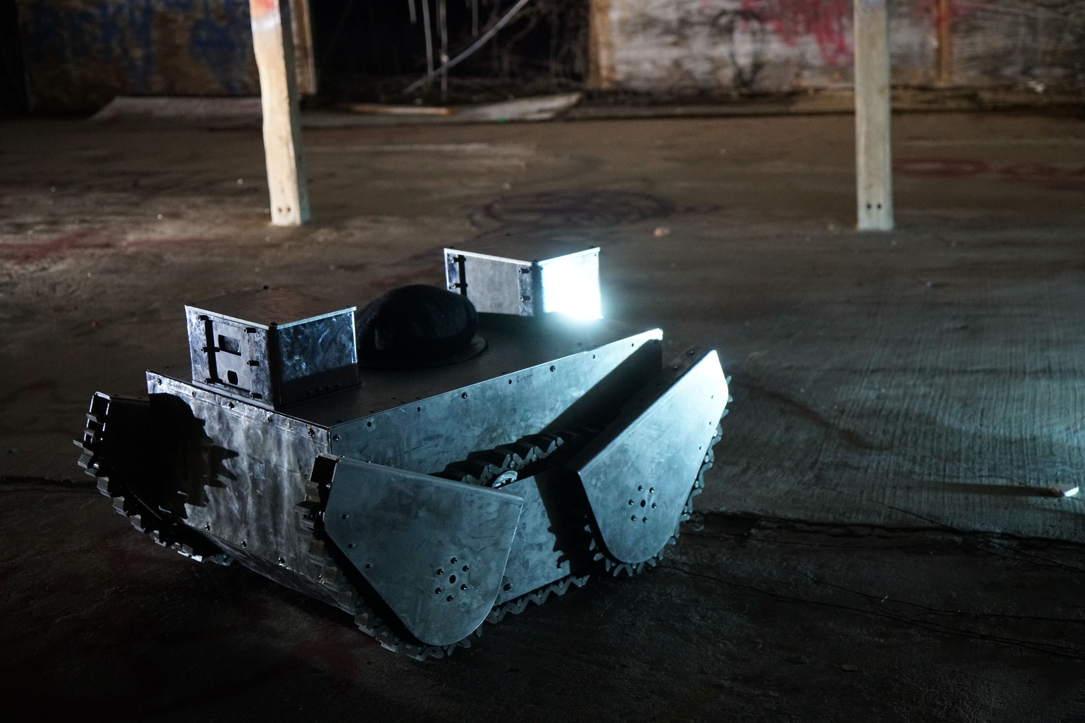 This version looks like a boxy tank. Its tread is, to borrow Thakur’s favorite word, rugged. The previous version was a little smaller, with two sets of more basic treads attached to a metal box with antennas on it.